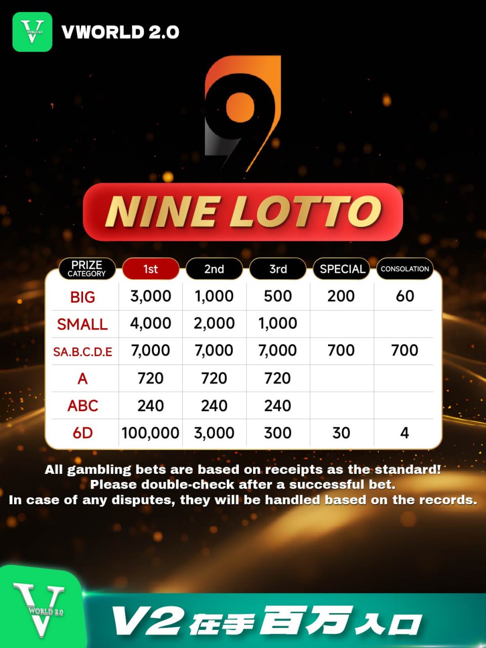 NINE LOTTO on features multiple prize categories with varying payouts. For a winning Big bet, 1st prize pays 3,000, 2nd prize 1,000, and 3rd prize 500. Special and Consolation prizes are also available. The Small category offers higher base payouts. Other unique categories like SA.B.C.D.E, A, ABC, and the high-reward 6D (with a top prize of 100,000) provide diverse ways to win.