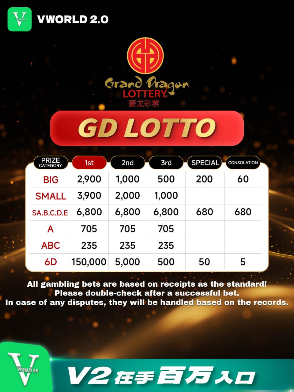 Grand Dragon Lottery, or GD LOTTO, presents another exciting structure on . Its Big category 1st prize pays 2,900, with a top 6D prize reaching an impressive 150,000. Similar to NINE LOTTO, it includes Small, SA.B.C.D.E, A, and ABC categories, each with defined payouts for 1st, 2nd, and 3rd places.