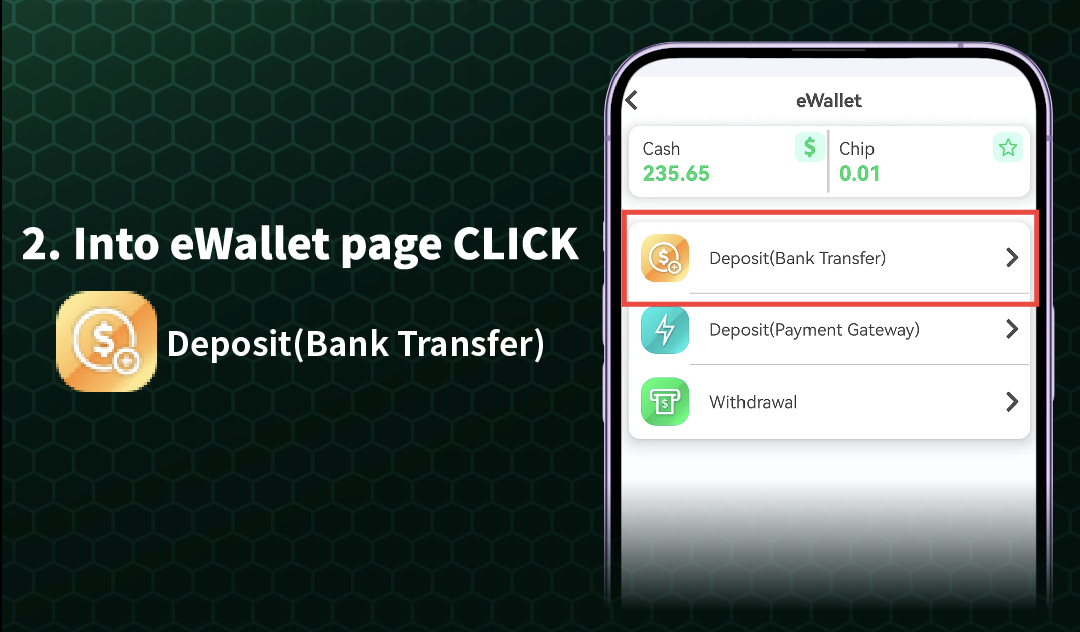 After tapping "Deposit," you will be directed to the eWallet or banking interface within the app. Here, you will see multiple funding options including "Deposit (Bank Transfer)" and "Deposit (Payment Gateway)." Select the method that suits your preference.