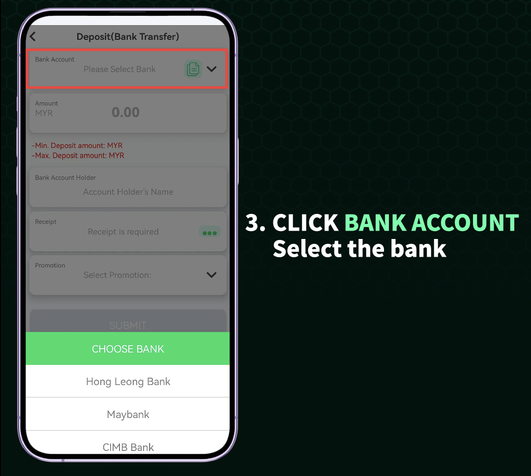 If you choose bank transfer, you will be prompted to select your bank from a list of supported financial institutions. After selecting your bank, follow the on-screen instructions to complete the transfer from your bank account or e-wallet to your account.