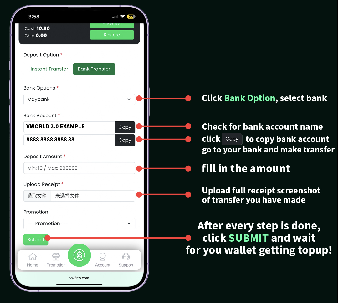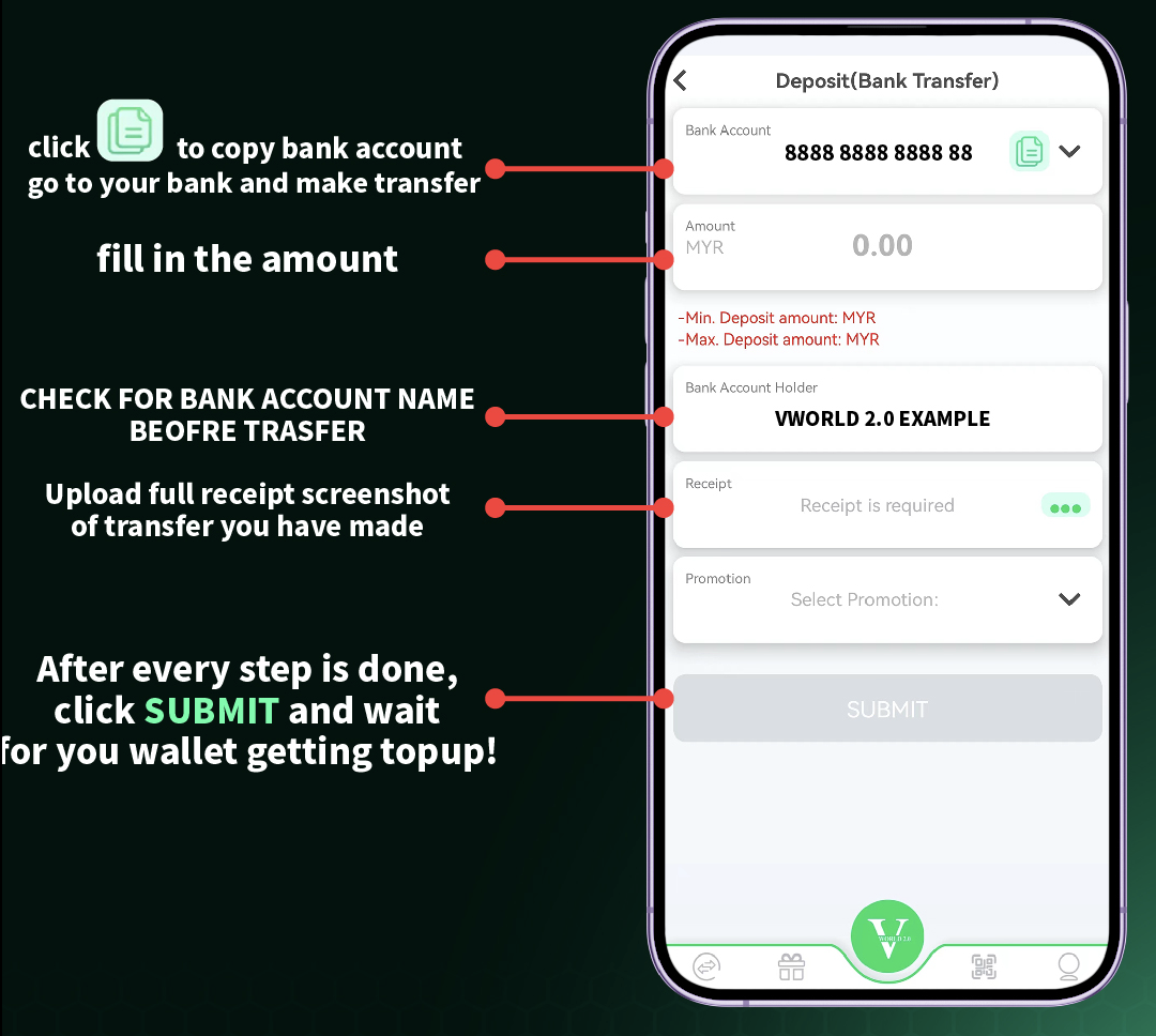 To ensure smooth transactions, always use the exact deposit amount and reference number if provided. Double-check the recipient account details displayed in your account before transferring. Transactions are typically processed quickly, but allow a few minutes for the funds to reflect in your balance.