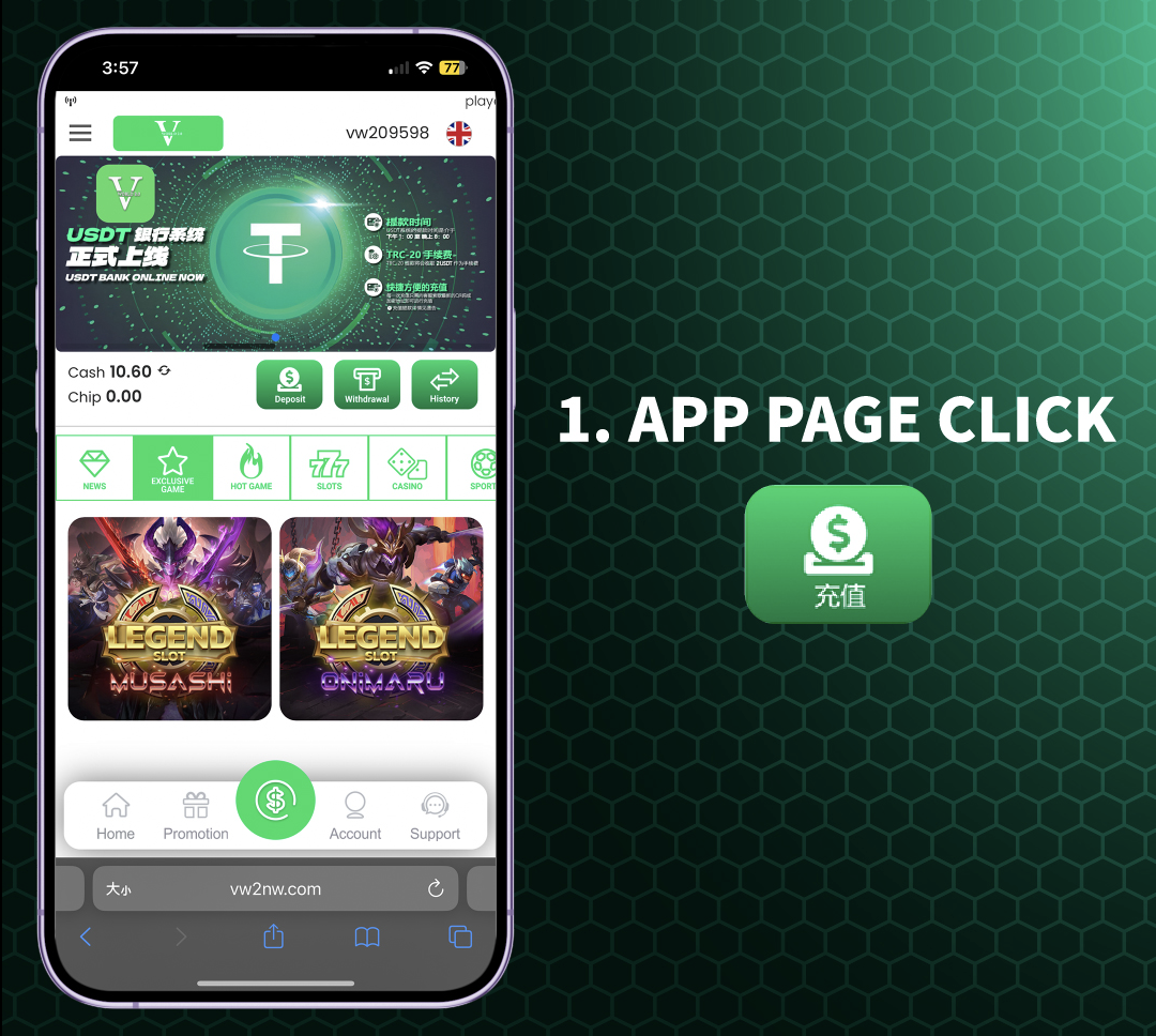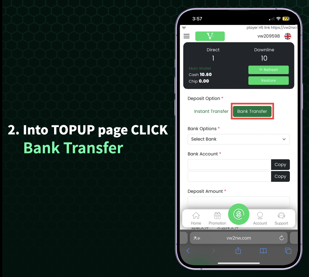 Log into your account through your mobile or desktop web browser. From the main interface or homepage, locate and click on the "Deposit" or "Bank Transfer" button to proceed to the top-up page.