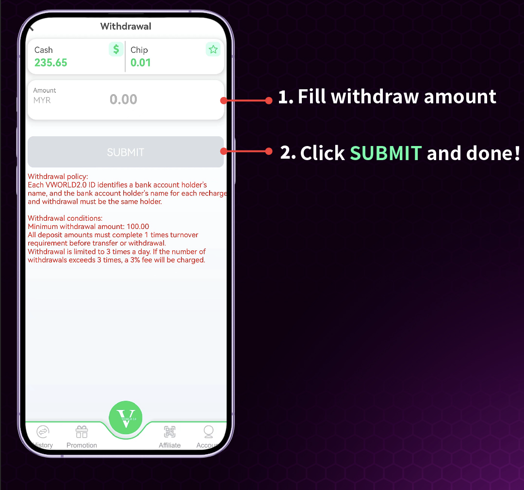 Choose "Bank Transfer" as your withdrawal method. Double-check that your registered bank details are correct. Once you have verified all information, tap the "Submit" button to finalize your withdrawal request.