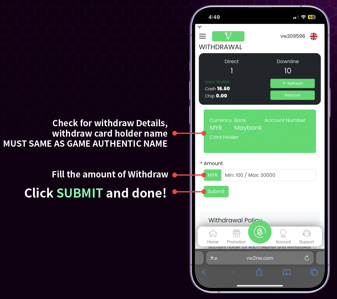 A crucial step in the withdrawal process is verifying your account information. Ensure that the registered bank account holder name matches exactly with your game account's authenticated name. Any discrepancy may cause your withdrawal to be rejected.